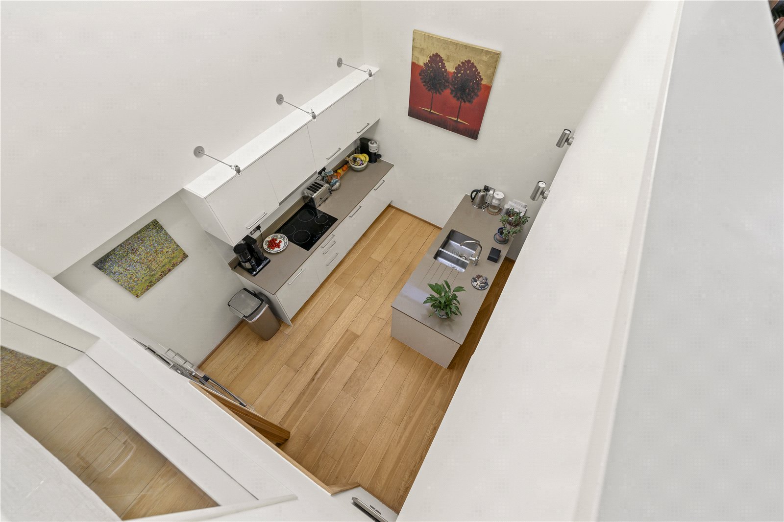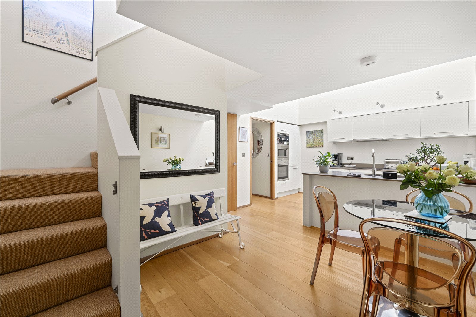 The first floor welcomes you into a bright and uplifting kitchen/breakfast room, enhanced by a vaulted ceiling and a large skylight that fills the space with natural light. Engineered wood flooring and a suite of high-spec appliances—including NEFF and Miele fittings plus a built-in coffee machine—create a sleek, modern feel. Two generous cupboards, useful for utilities and storage seamlessly integrate, ensuring the space remains both practical and elegant.