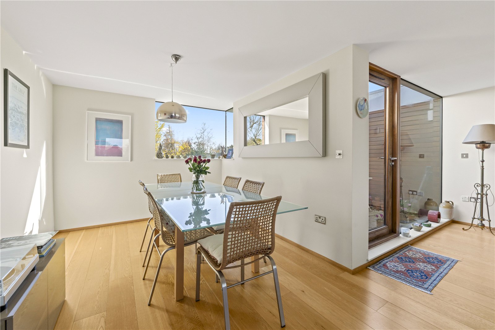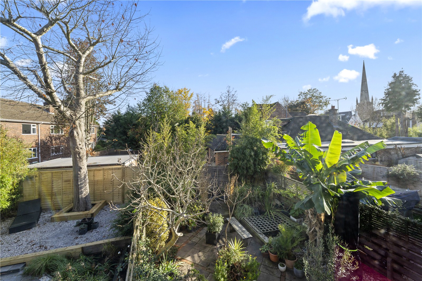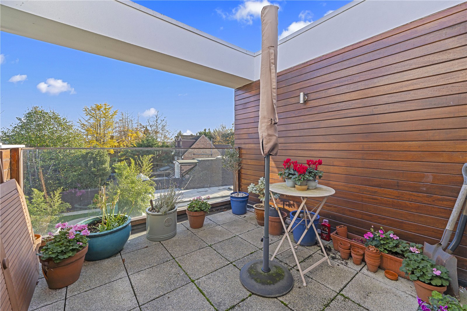 The entire top floor is dedicated to a remarkable open-plan reception space—an expansive room designed for relaxing, dining, working and entertaining. Flooded with natural light and opening directly onto a private roof terrace with long-reaching rooftop views across Hampton Hill, this is a truly standout feature of the home. An internal feature balcony links both levels, adding architectural interest and a superb sense of openness.