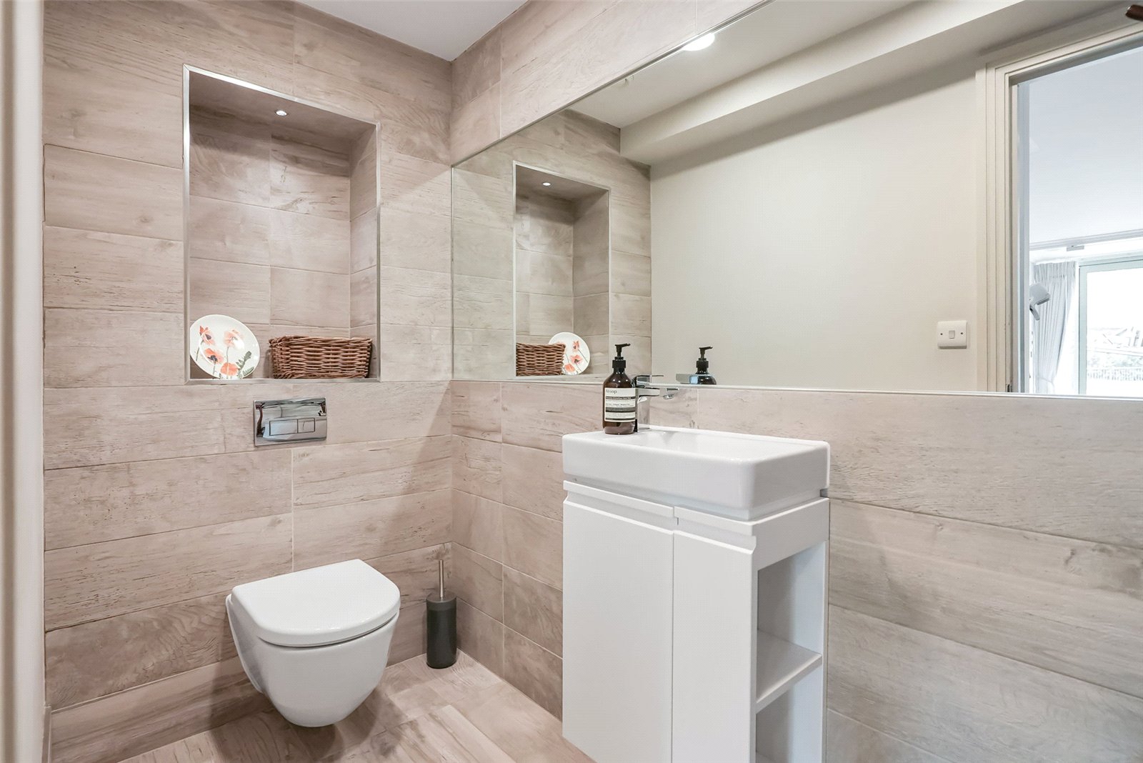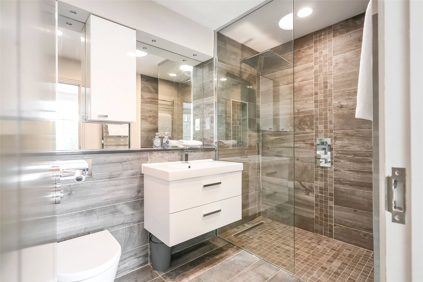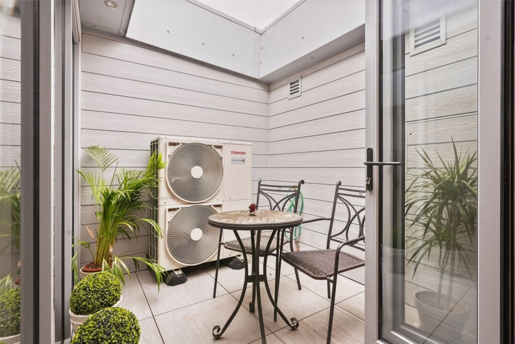 Upstairs boasts two spacious bedrooms with stylish integrated wardrobes and spa-style en-suite bathrooms with underfloor heating, heated towel rails and natural skylights, along with a private terrace and a walk-in airing cupboard. There is also secure off-street parking with a dedicated space right outside the house, along with private external storage, Toshiba air conditioning with filtered heat exchange ventilation, Sonos sound system, Auto-mist fire safety system and Megaflo boiler.