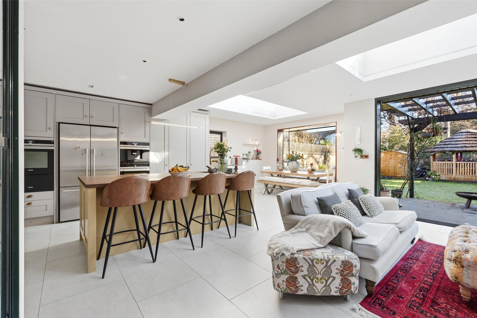 At the centre of it all sits a bespoke Callaghan kitchen, finished to an exacting standard and designed for serious cooking, entertaining and everyday family life alike. Large-format glazing opens directly onto the private rear garden, making summer gatherings effortless. A utility room and downstairs WC keep practicalities neatly tucked away.