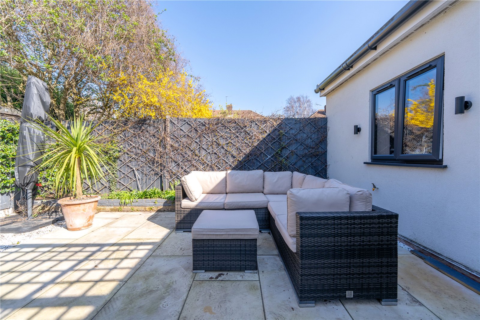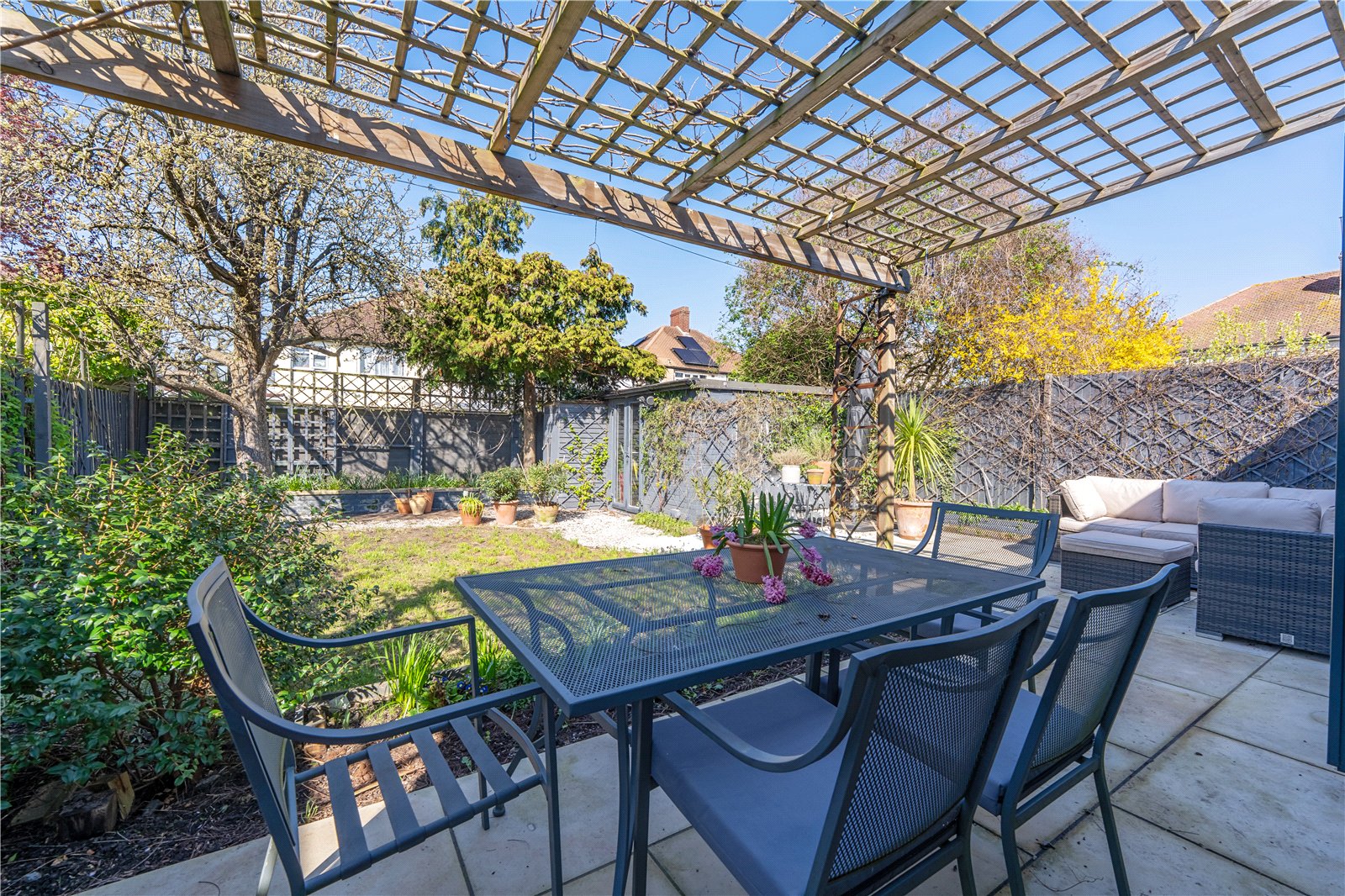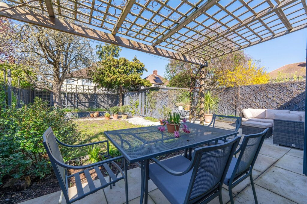 Step outside to the west-facing garden, where you'll find a porcelain tied patio with pergola perfect for outdoor living.