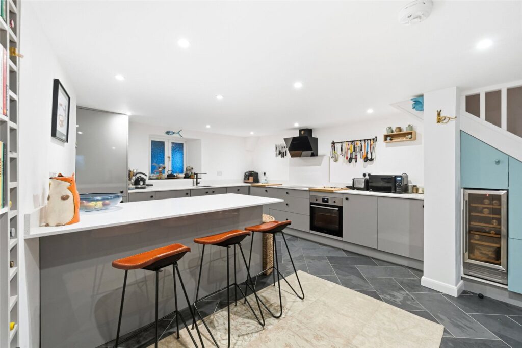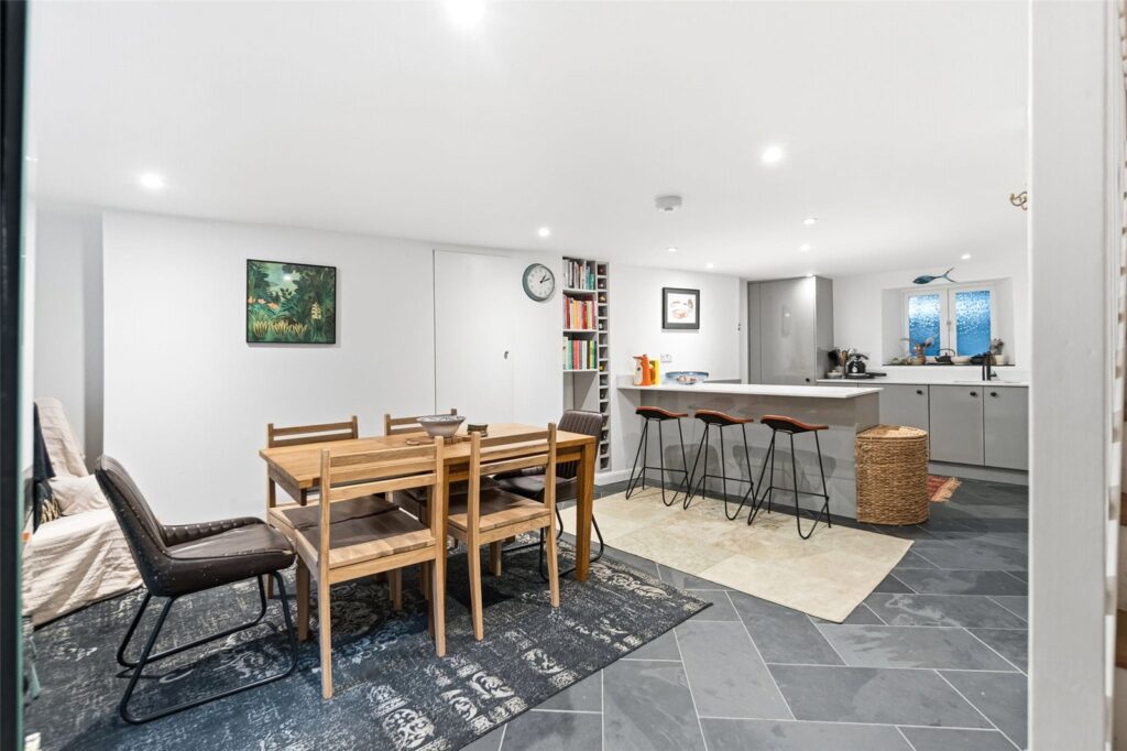 The kitchen is positioned on the lower ground floor and forms a real social hub of the home, with ample space for dining. This level works perfectly for family life and more informal gatherings, with a natural connection through to the garden.