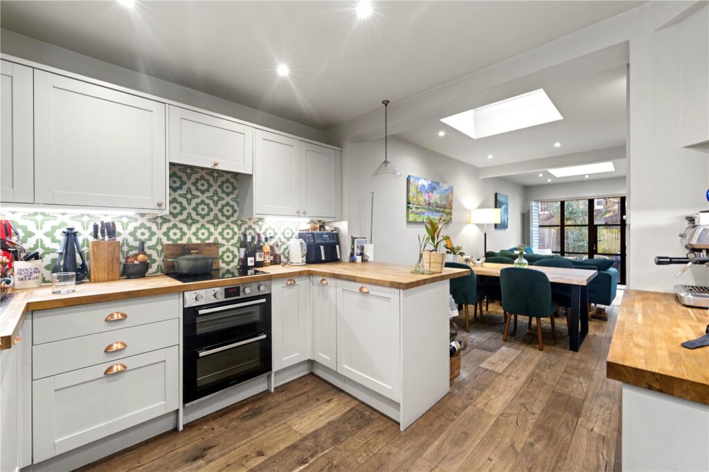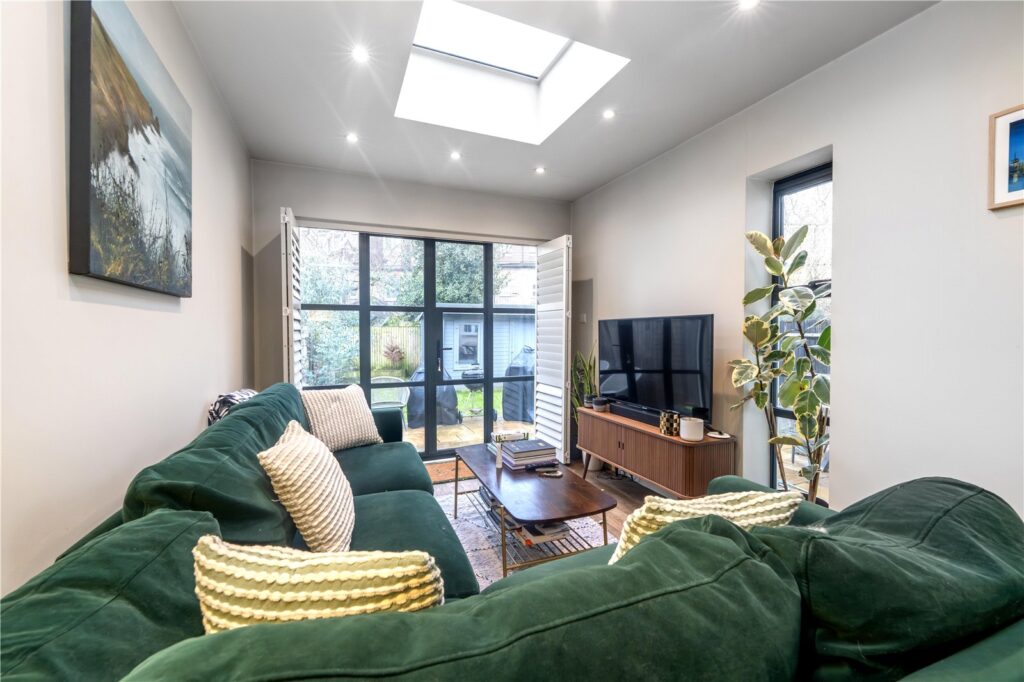 The heart of the home is a generous 22ft reception room, opening directly onto the garden — ideal for entertaining, family time or simply enjoying the space. The separate kitchen sits neatly alongside, while the overall layout provides up to four bedrooms, two of which are currently used as studies, making this a brilliant option for home-working households or those needing adaptable space.